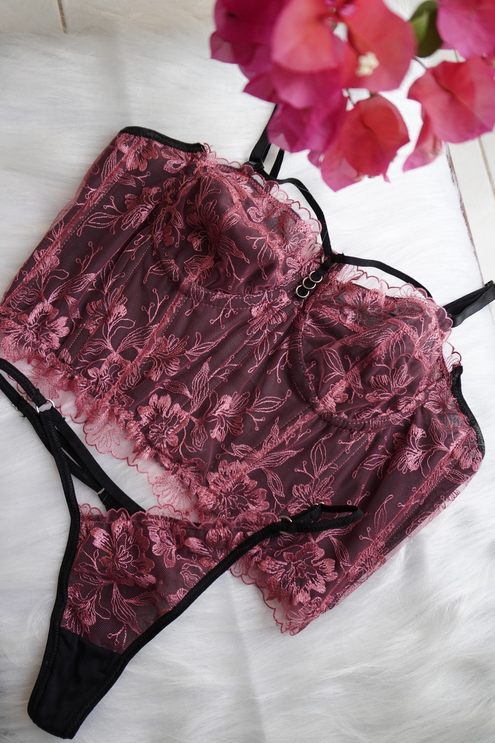 Corset y tanga en tul bordado rojo pastel, espalda graduable para que se ajuste a tu figura, pocas unidades disponibles 🍃