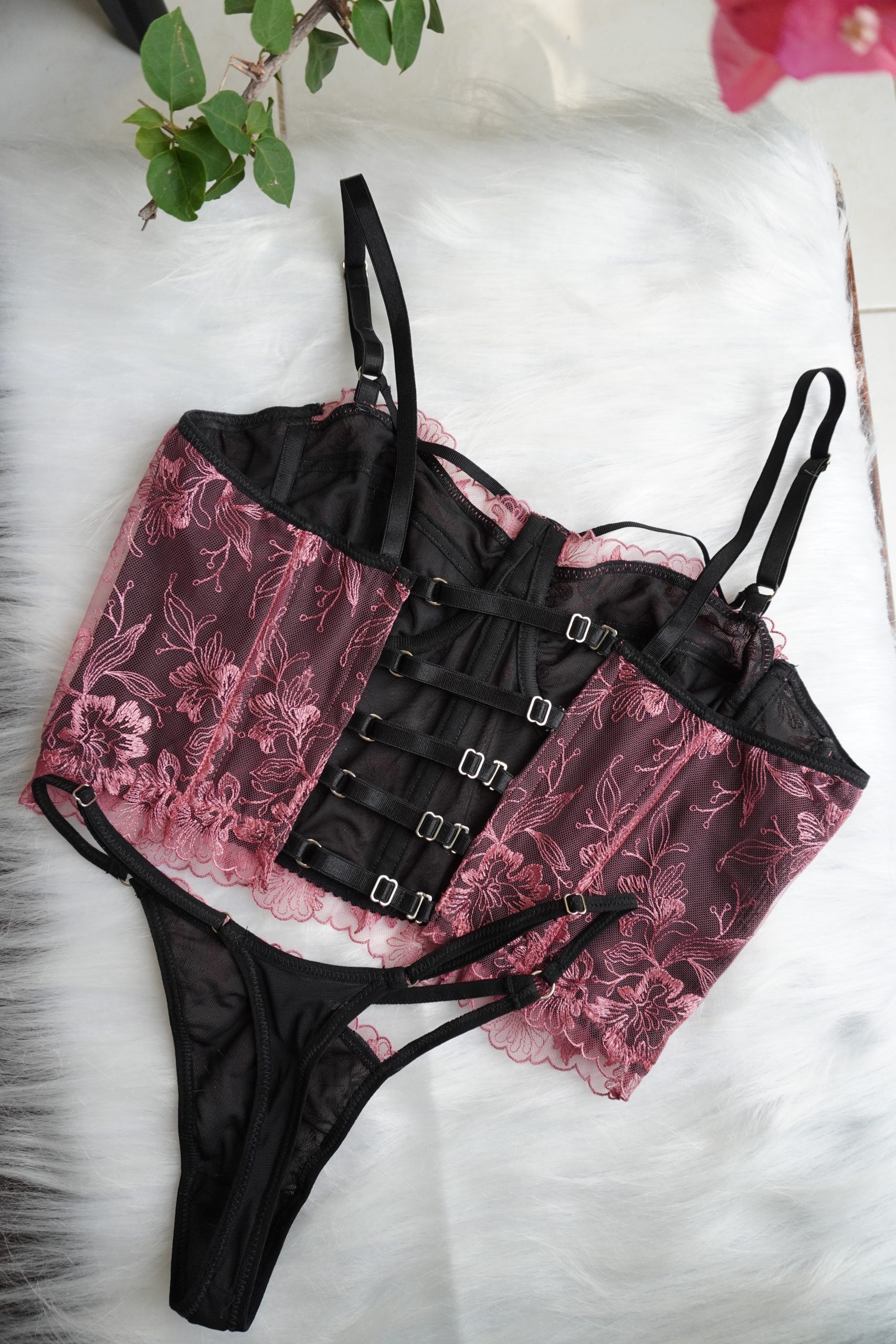 Corset y tanga en tul bordado rojo pastel, forrados en satén negro para mayor confort. Incluye varillas que ayudan a mantener la forma y un aro en la copa (sin rellenos ni espumas para un acabado natural). La espalda es graduable para que se ajuste a tu figura y puedes usarlo tanto como ropa interior como exterior. Pocas unidades disponibles 🍃