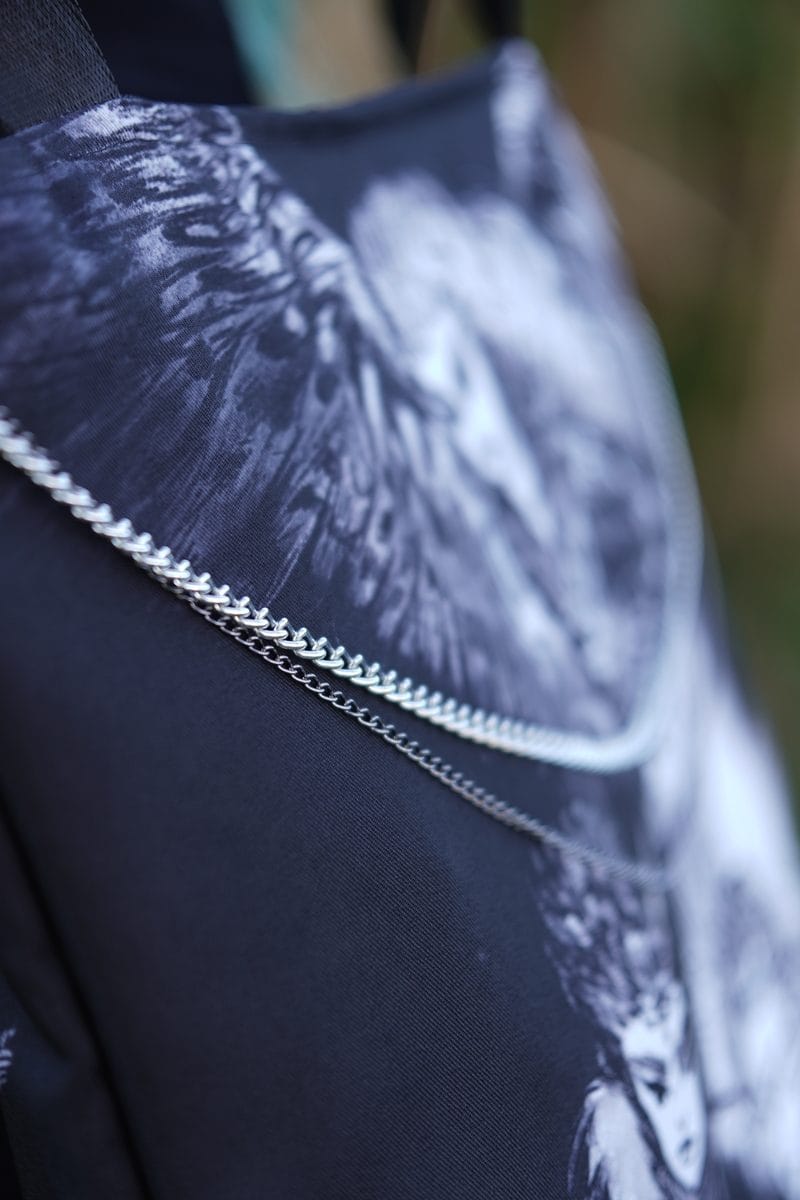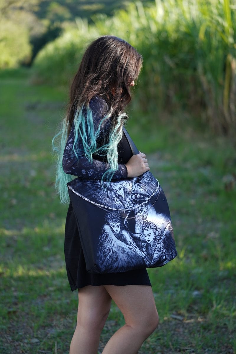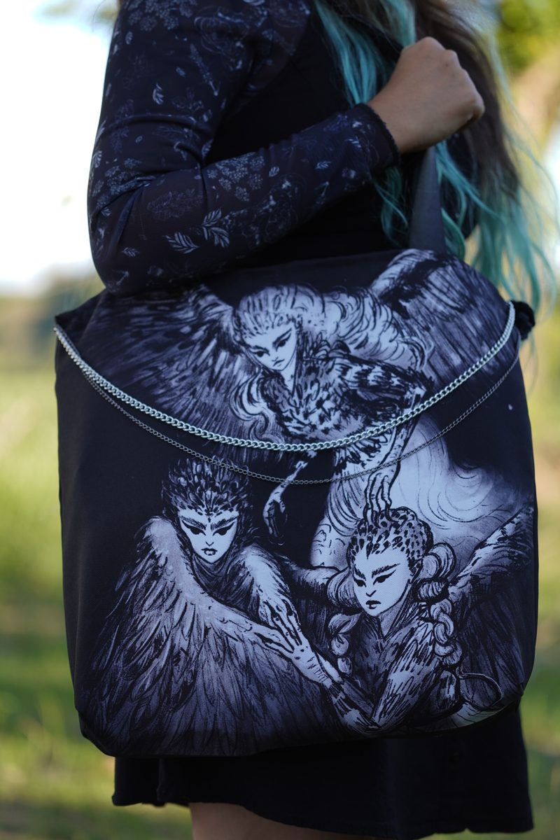 • Diseño Doble Cara: Ilustración original de las tres Arpías (Aelo, Ocípete, Celeno) creado por las garras de una de nuestras arpías, sublimada en ambas caras.