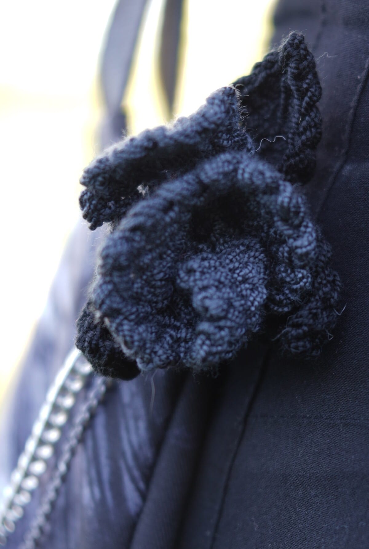 • Detalles Únicos: Cadenas decorativas metálicas + rosa gris tejida colgando como amuleto místico.